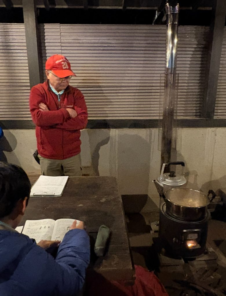 この日は、くまキャンプで実施できなかった、つきのわ集会を実施しました。ボーイ隊への上進に備えて、その心得を学ぶ場です。生憎、全員の都合がつかず、くまスカウトがそろわなかったため、今年は分散しての実施となりました。冷え込みが強く、冷たい雨もパラパラと降り始める中、ストーブで暖をとりながら、ボーイ隊長から指南を受けます。