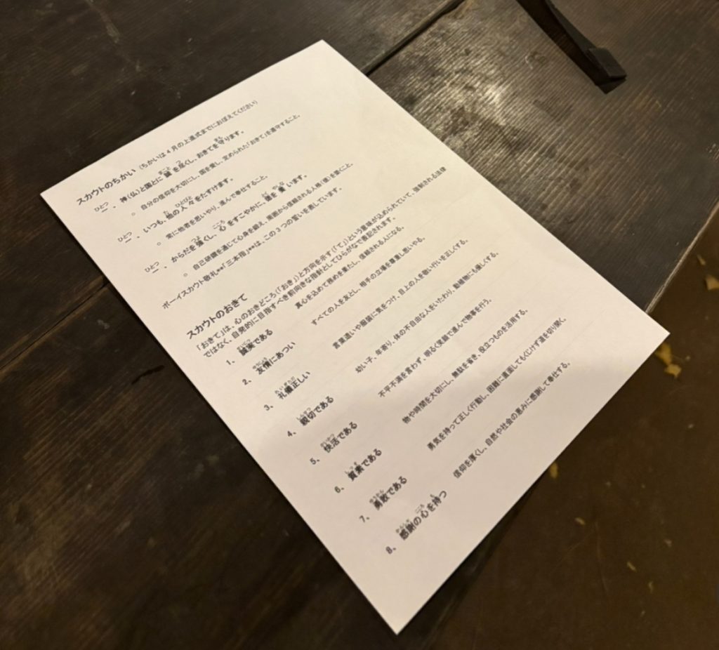 毎回の活動で実践している「やくそくとさだめ」。ボーイ隊では「ちかいとおきて」に変わり、数も増え、その内容も然ることながら、覚えるのが大変になります。これらのうち、5つのちかいを上進式までに覚えるように話がありました。