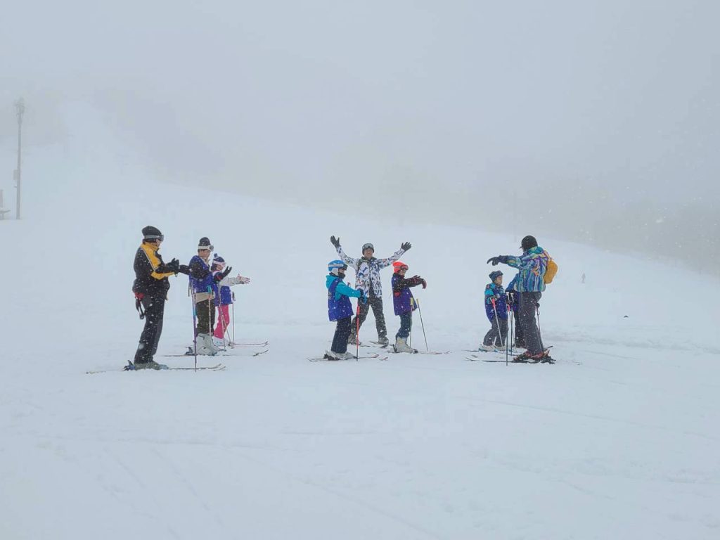 ゲレンデに向かう頃には、雨は雪に変わっていました。青空とはまた違う幻想的な雪景色の中、レッスンのスタートです!