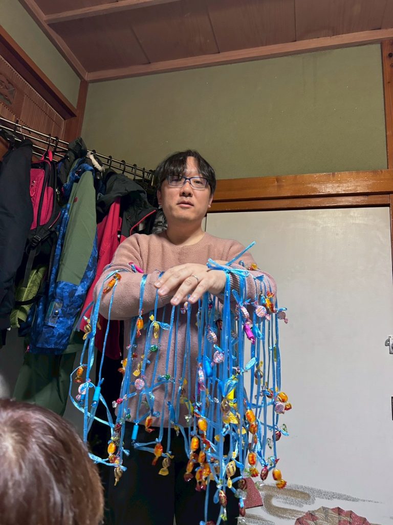 部屋の隅に目をやると…景品の首飾りを纏うその御姿が。その厳かな雰囲気たるや。11月の鋸山ハイキングから付いていらしゃったのかもしれません🙏