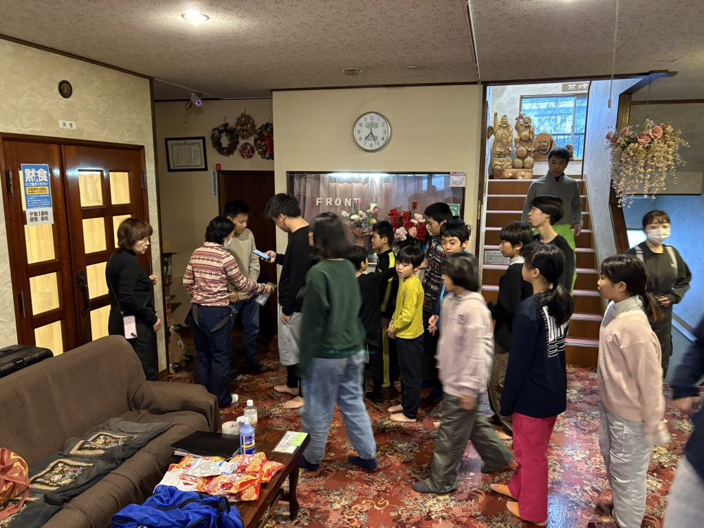雨の降る朝となりました。ボーイスカウト浦安第2団のスキー合宿は二日目です。前日の夜に、予め朝食後にすぐに出発できるように伝えられていたスカウト達は、しっかり準備を整えてから、食堂前に集まります!