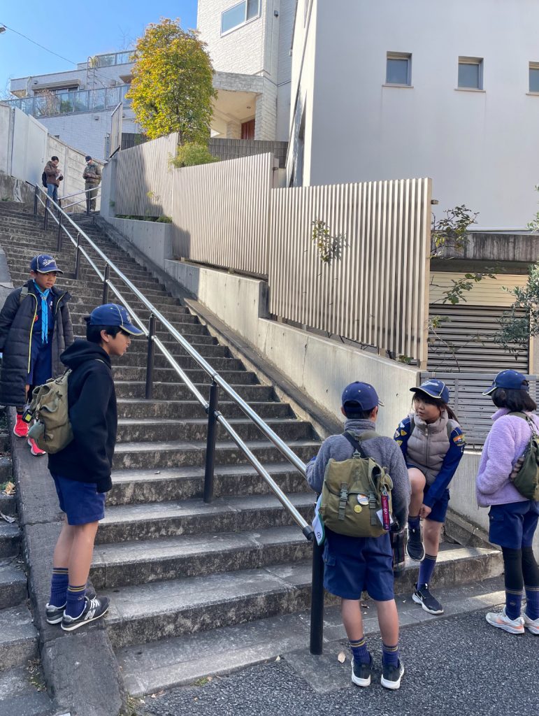こちらの組は、迷って、迷って、迷いながら進んでいる様子。デンリーダーだって、そう簡単には手を差し伸べません!スカウト達が力を合わせて解決するように見守るのも役割の一つです。時間ギリギリで寺社で撮影する余裕もなかったとか💦