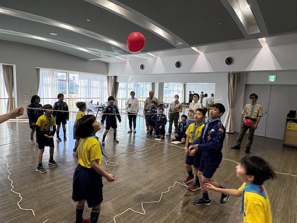 早速、ロープでコートを作り、ゲームの開始です。試合は総当たり戦で、競技にあたらない組も審判役に回ります。全員触れる前についつい風船を返してしまったり、仲間にぶつけてしまったり、随所に笑いどころがありながら、盛り上がりました!