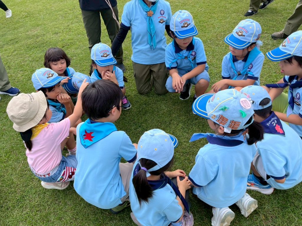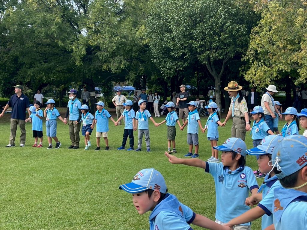 各地区のビーバースカウトがだい・しゅう・ごう! 今年のテーマは「ビーバー万博」。ひろーい芝生の広場に、いつもの集会とは違った、各団がいっしょになったとっても大きいリングが完成!