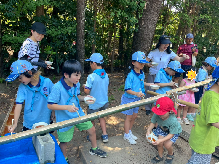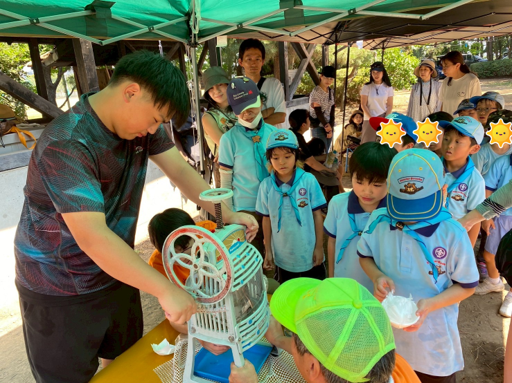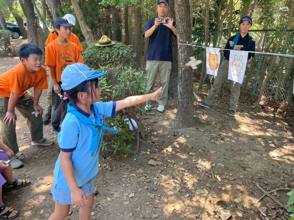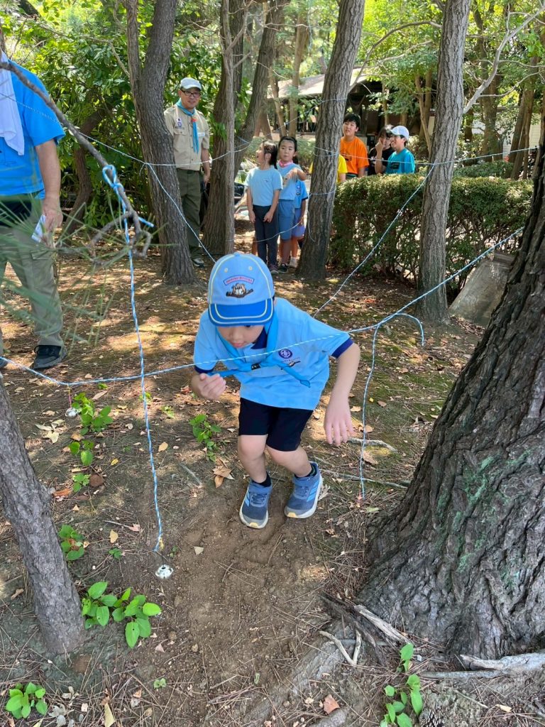 ビーバー隊は3つのグループにわかれて、カブ隊と合同グループを結成。組のみんなで自己紹介をしたら、3つのゲームにチャレンジ。1つは、木の間に鈴をつけたひもを張りめぐらして、音が鳴らないようにすすむ「くもの巣くぐり」。2つめは、目かくしをしてロープをたどって目的地へむかう「暗やみをすすめ」。そして、牛乳パックのパーツをその場で組み合わせて手裏剣を作って、マトにあてる「手裏剣しゅぎょう」。ボーイ隊のみんなもくわわって、ゲームをたのしみました!