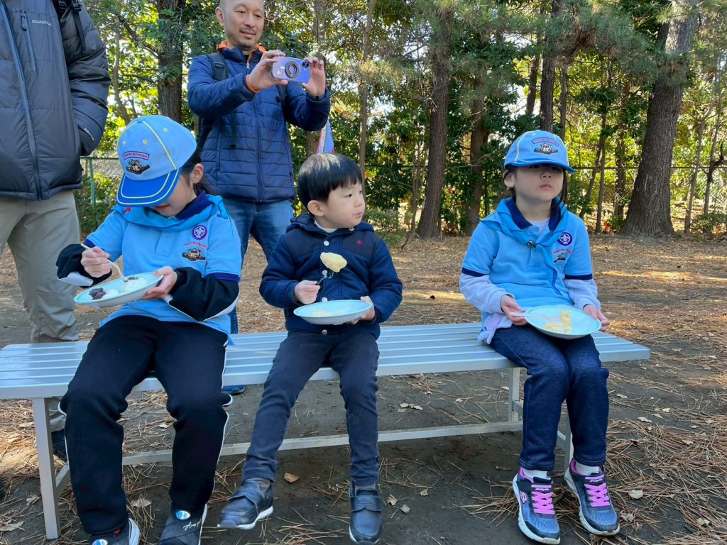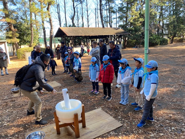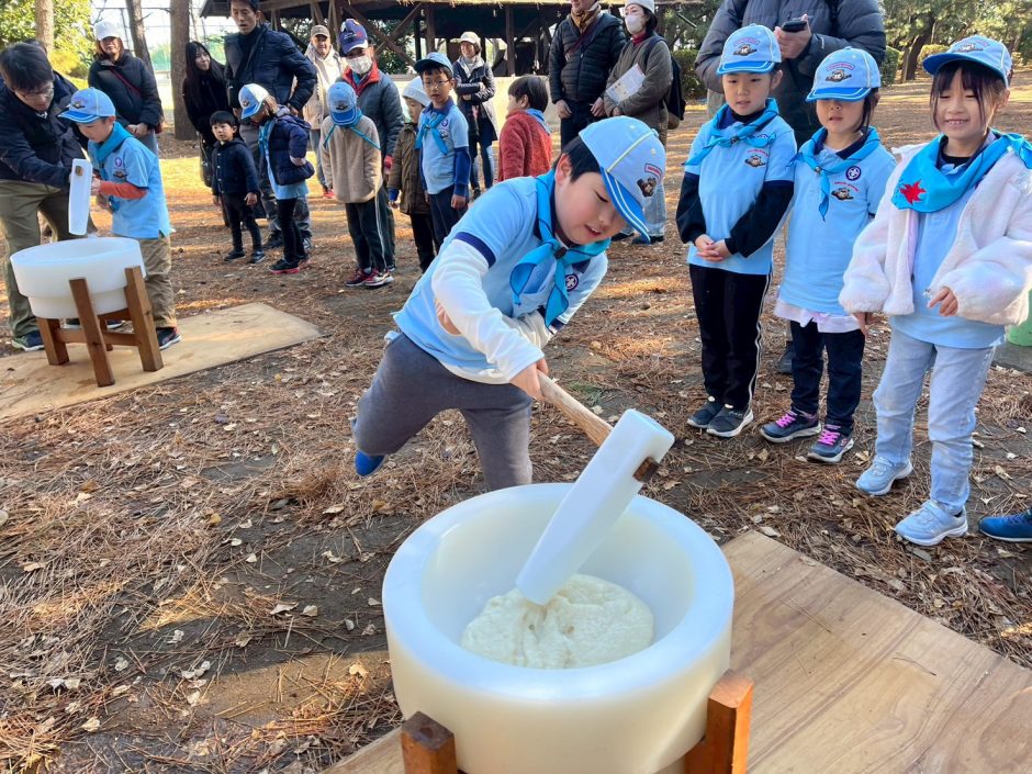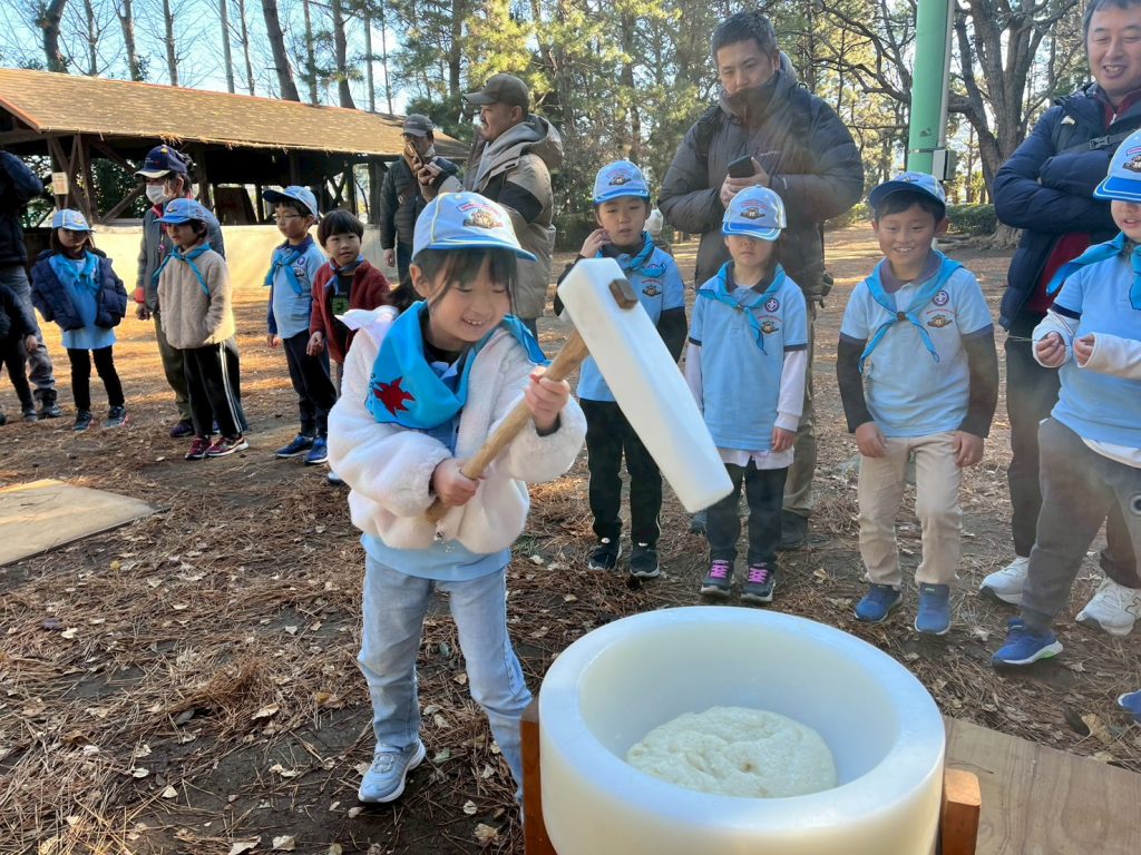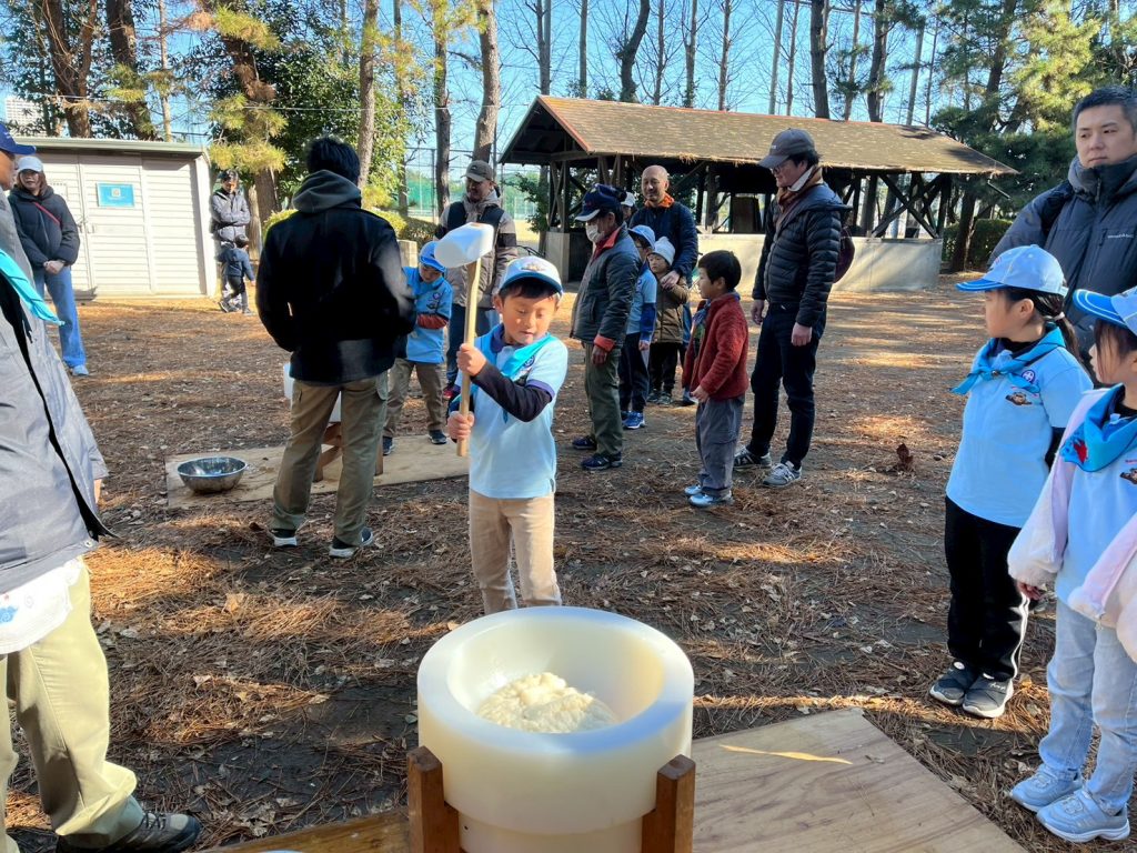 カブ隊以上の隊がスキーキャンプに出発した1月10日。浦安に残されたビーバー隊も楽しく活動したい! ということで、今川少年の広場でもちつきです!