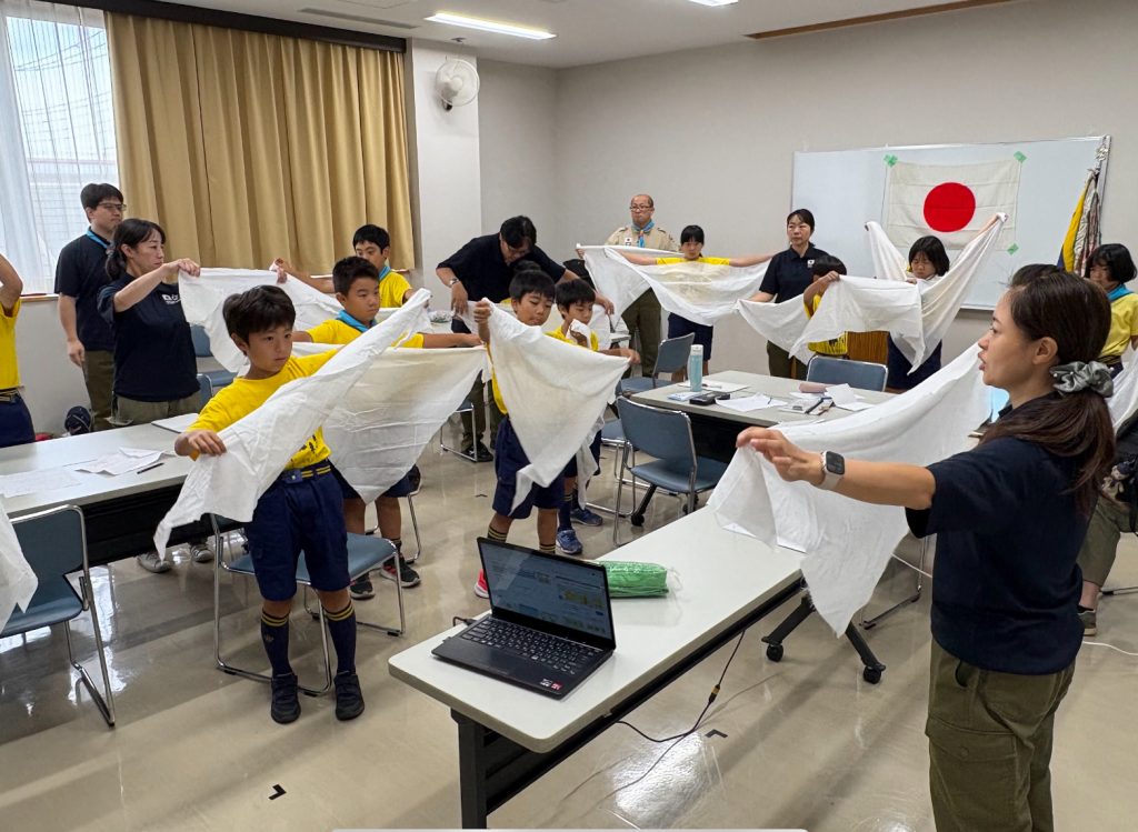 まぁ、三角巾を折りたたんでいるときから想像してましたが、まぁ、こうなります。頭を怪我し、骨折したスカウトが続出した公民館になりました。楽しみながら三角巾の使い方を学んだスカウト。